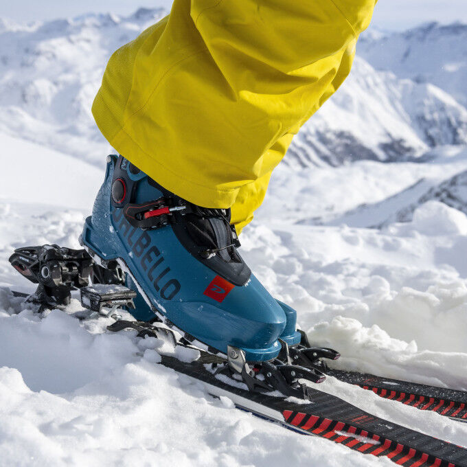 Tourenskibindungen sind vorne mit Dornen ausgestattet, die den Schuh festhalten und gleichzeitig die Ferse freigeben. Bei der Abfahrt werden sie verriegelt und funktionieren nach demselben Prinzip wie eine Alpinskibindung.