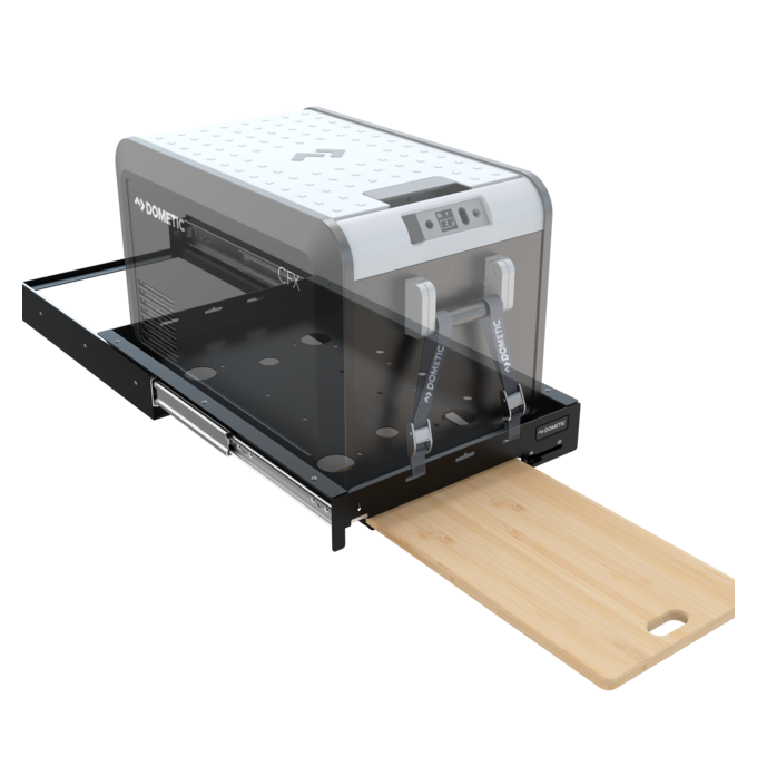 Take your kitchen everywhere! With Dometic's SLIDE slide , you can easily access your refrigerator and take advantage of a built-in board for easy cooking.