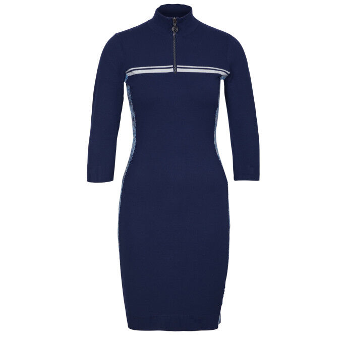 Ladies, this is a must-have item in your wardrobe for a trendy look. This skin-tight, fine-knit dress has 3/4-length sleeves and a high zip collar, so it's very comfortable to wear. The snake-patterned side stripes add a unique character to this Sportalm dress.