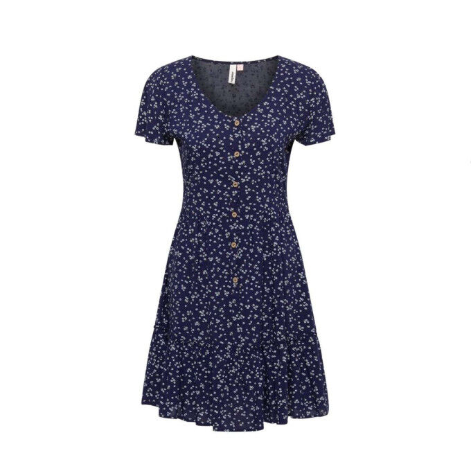 This summer dress stands out with its elegantly fitted cut, enhanced by a full button placket at the front. Soft pleats at the sleeves add a touch of understated sophistication, while light ruffles at the hem add a fluttering charm with every movement.The rounded neckline completes the silhouette with a touch of feminine simplicity.